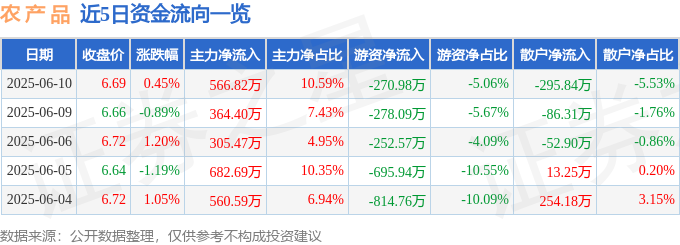 本站消息,截至2025年6月10日收盘,农 产 品(000061)报收于6.69元,上涨0.45%,换手率0.47%,成交量8.02万手,成交额5353.26万元。